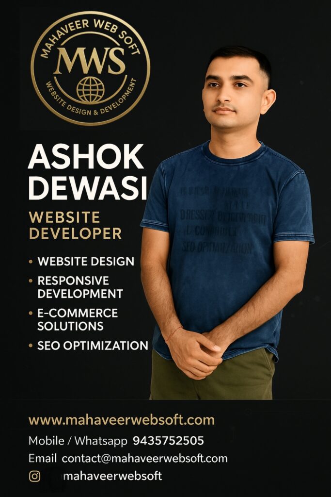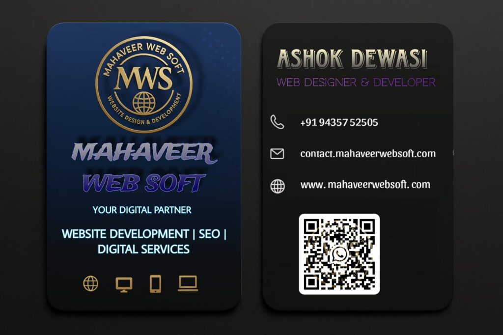 About Mahaveer Web Soft is a trusted digital service provider, offering modern, mobile-friendly digital visiting cards designed to make your business stand out online. We help individuals and businesses build a smart digital identity that's easy to share and always accessible. Our digital cards are fully customized and include powerful features like: 📲 One-click contact save 💬 WhatsApp direct link 📄 Brochure download 📌 Google Map location 🔗 Social media links 🔳 QR code for instant sharing Whether you're a freelancer, shop owner, or professional service provider – we deliver clean, creative, and fully responsive cards that represent your brand perfectly.